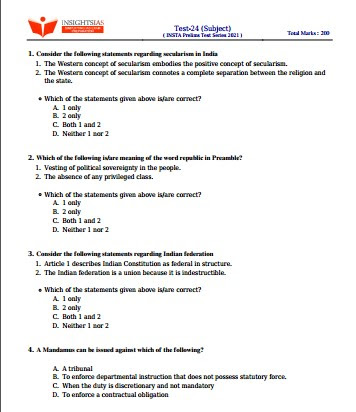 Click Here to download Insight IAS Prelims 2021 Subject wise Test 24 with Solution PDF